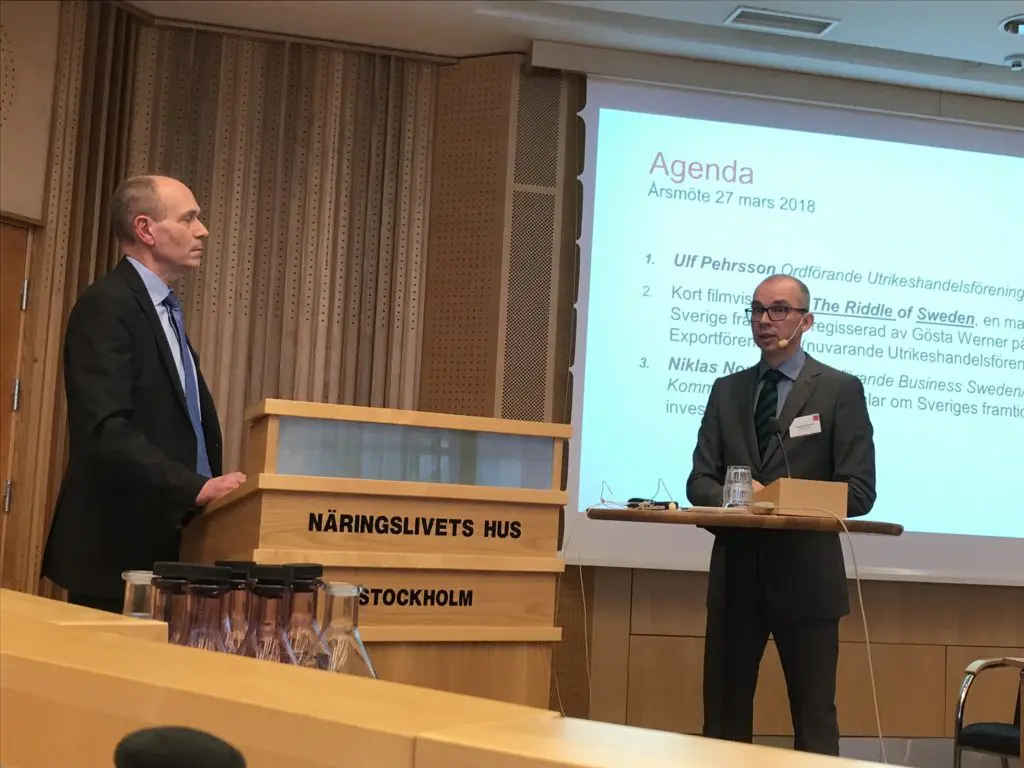 På bilden: Ordförande Utrikeshandelsföreningen Ulf Pehrsson och gästtalare Niklas Nordström, ordförande Business Sweden Sveriges Allmänna Utrikeshandelsförening höll den 27e mars 2018 stämma och årsmöte i Näringslivets hus. Under årsmötet visades delar av filmen ”The Riddle of Sweden”, en marknadsföringsfilm om Sverige från 1963 som fokuserar på hur framgångsrikt Sverige redan var då och om svenska produkter som exporterades […]